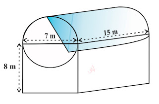 Example 5 : Shanta runs an industry in a shed which is in the shape of a cuboid surmounted by a half cylinder (in the figure). If the base of the shed is of dimension 7 m × 15 m, and the height of the cuboidal portion is 8 m, find the volume of air that the shed can hold. Further, suppose the machinery in the shed occupies a total space of 300 m³, and there are 20 workers, each of whom occupy about 0.08 m³ space on an average. Then, how much air is in the shed? (Take ฯ = 22/7 )